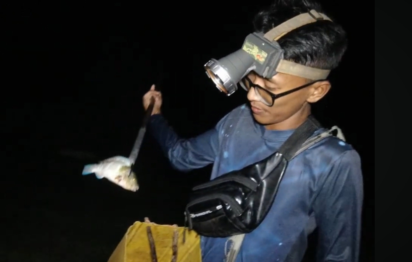 Berbekal senter kepala, ember, parang, tombak dan serokan jaring, lelaki yang telah mempunyai anak tiga ini turun di bibir pantai ketika air laut surut. Menggunakan sepatu bot yang terbuat dari karet, langkah kakinya mulai menyusuri daerah laut yang dangkal.
