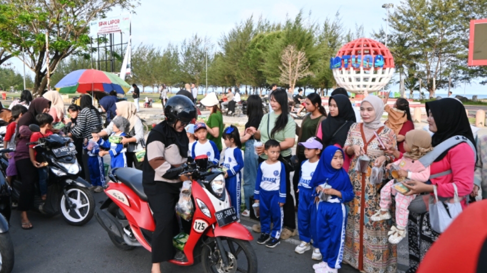 NATUNA — Murid TK dan KB Angkasa Lanud Raden Sadjad (Lanud RSA) Natuna menunjukkan kepedulian sosial dengan membagikan takjil gratis di sepanjang jalan depan Alun-Alun Pantai Piwang Ranai, Rabu (25/2/2026).