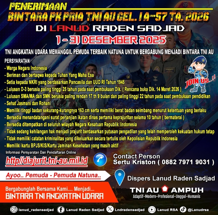 Untuk informasi lebih lanjut bisa menghubungi Sertu Kriston (088279719031), Dispersonel Lanud Raden Sadjad Natuna. (red)