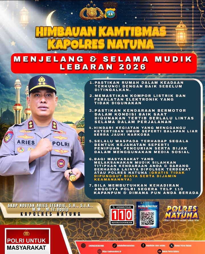 Natuna, AnalisisPos.com – Menjelang arus mudik dan perayaan Idul Fitri 1447 Hijriah, Kapolres Natuna Novyan Aries Efendie mengimbau masyarakat untuk tetap menjaga keamanan, ketertiban, serta keselamatan selama menjalankan aktivitas mudik Lebaran tahun 2026.