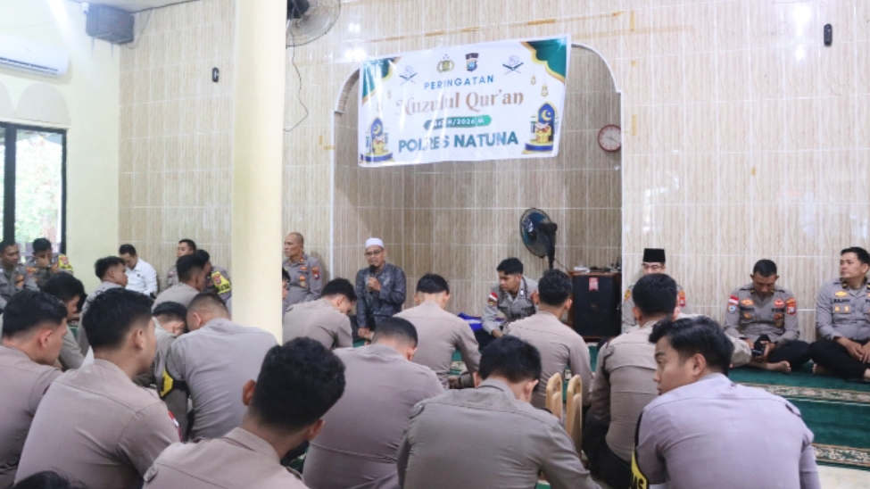 NATUNA, AnalisisPos.com – Dalam rangka meningkatkan keimanan dan ketakwaan di bulan suci Ramadan, jajaran Polres Natuna menggelar peringatan Nuzulul Qur’an 1447 Hijriah di Musholla Al Jannah Polres Natuna, Senin (9/3/2026).